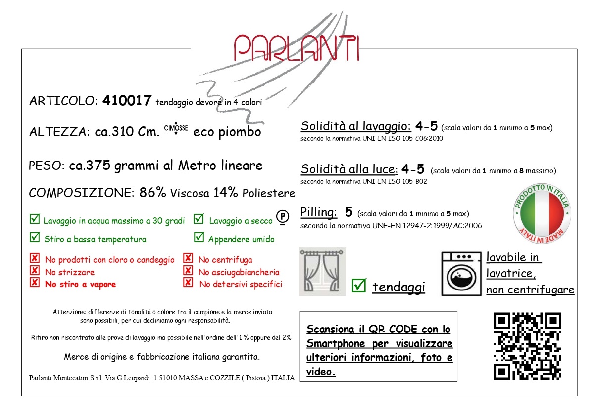 L'articolo 410017 è un elegante tendaggio devoré di qualità superiore, di origine e fabbricazione italiana, realizzato in 310 centimetri di altezza su fondo in organza e rifinito in basso con eco piombo.